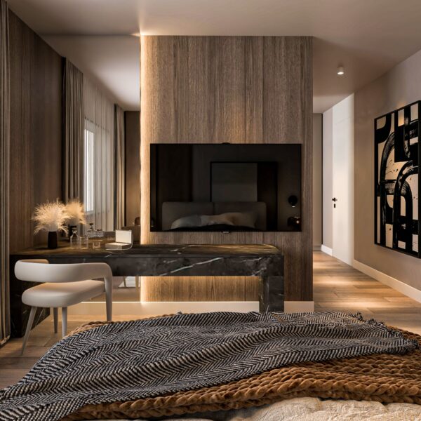 • Lighting Design: Carefully placed ambient and accent lighting highlights materials and architectural features, enhancing comfort and spatial perception.