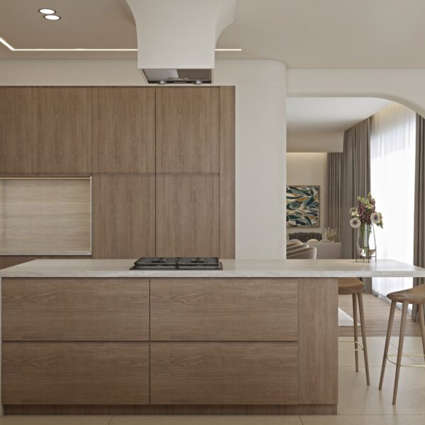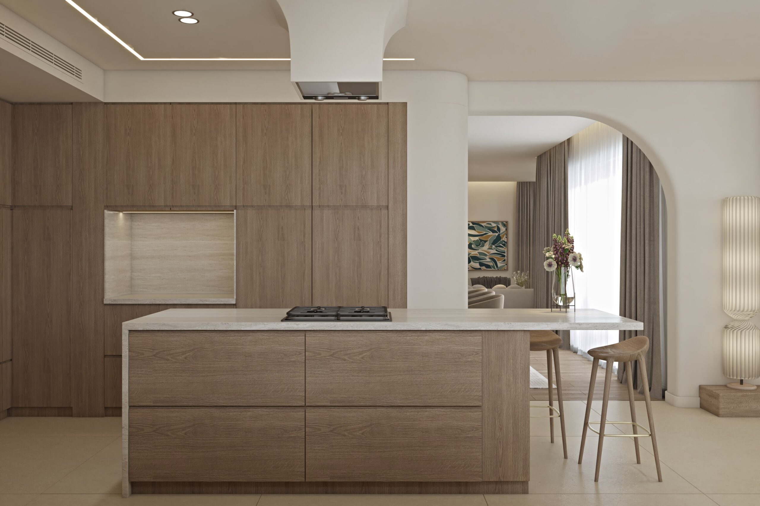 • Curved Kitchen Design: The kitchen features a striking curved layout that softens the geometry of the space, enhancing movement and creating a sculptural focal point.