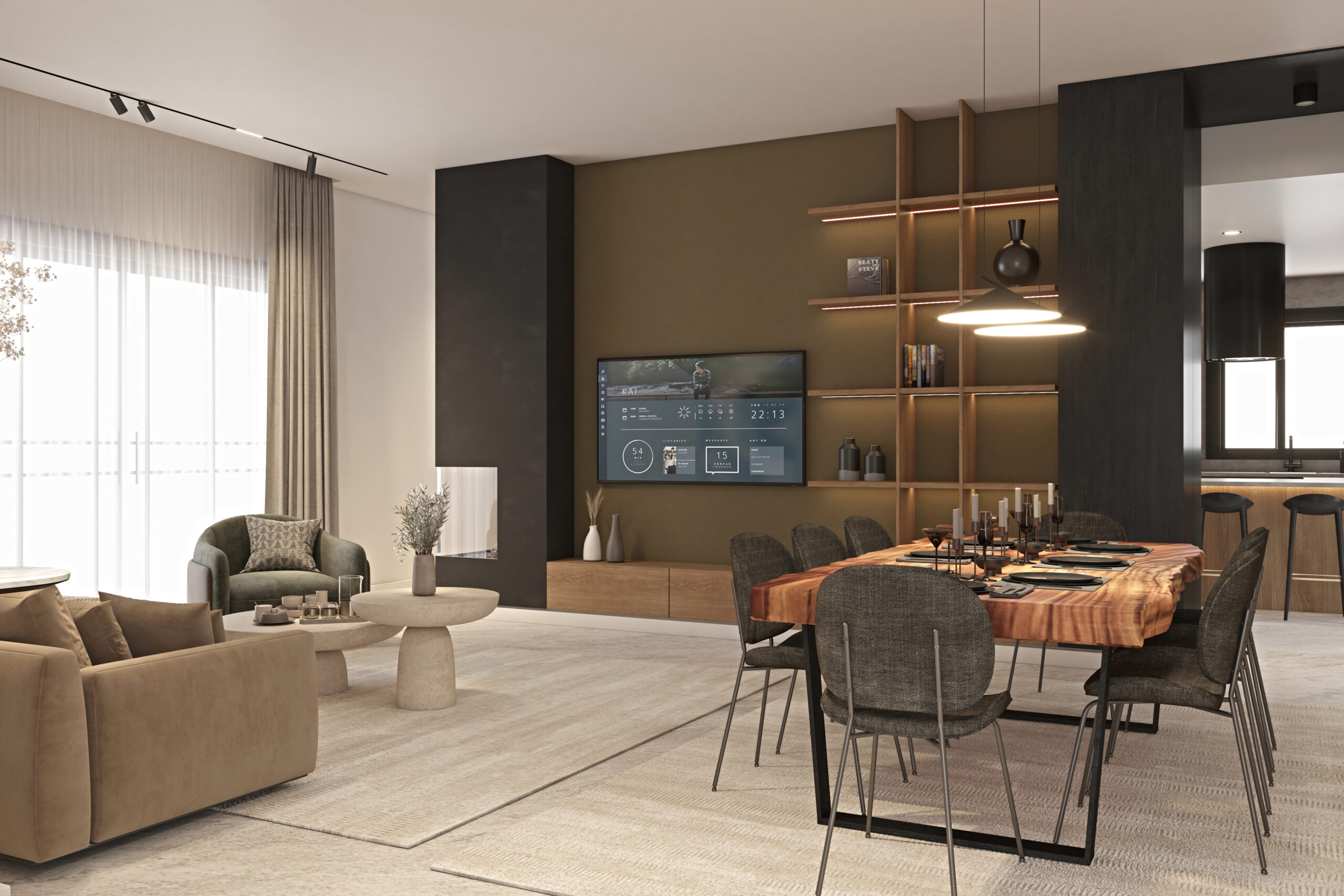 • Warm wood surfaces blended with black architectural elements