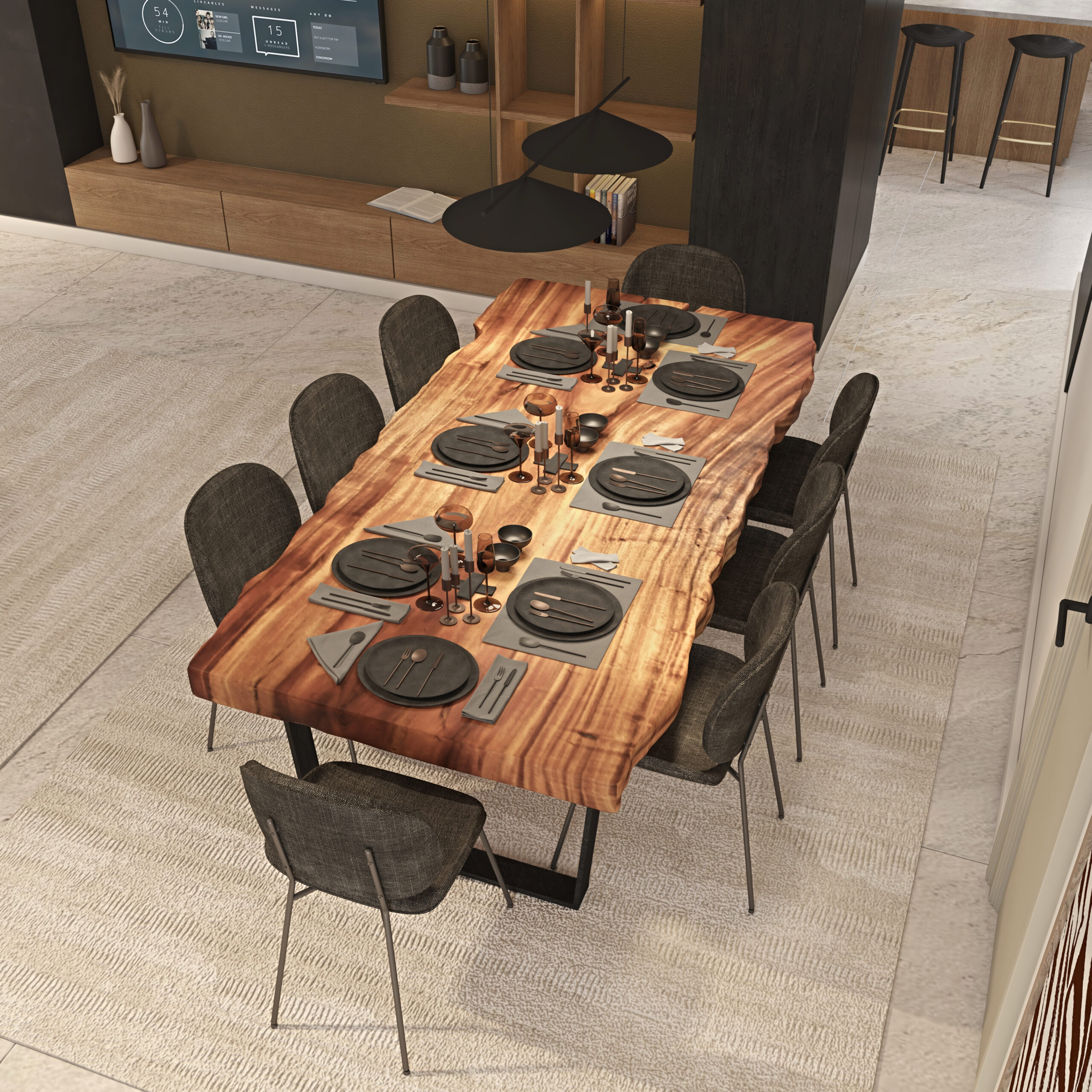 The wood blended with black creates depth, contrast, and visual sophistication while maintaining a clean and cohesive atmosphere.