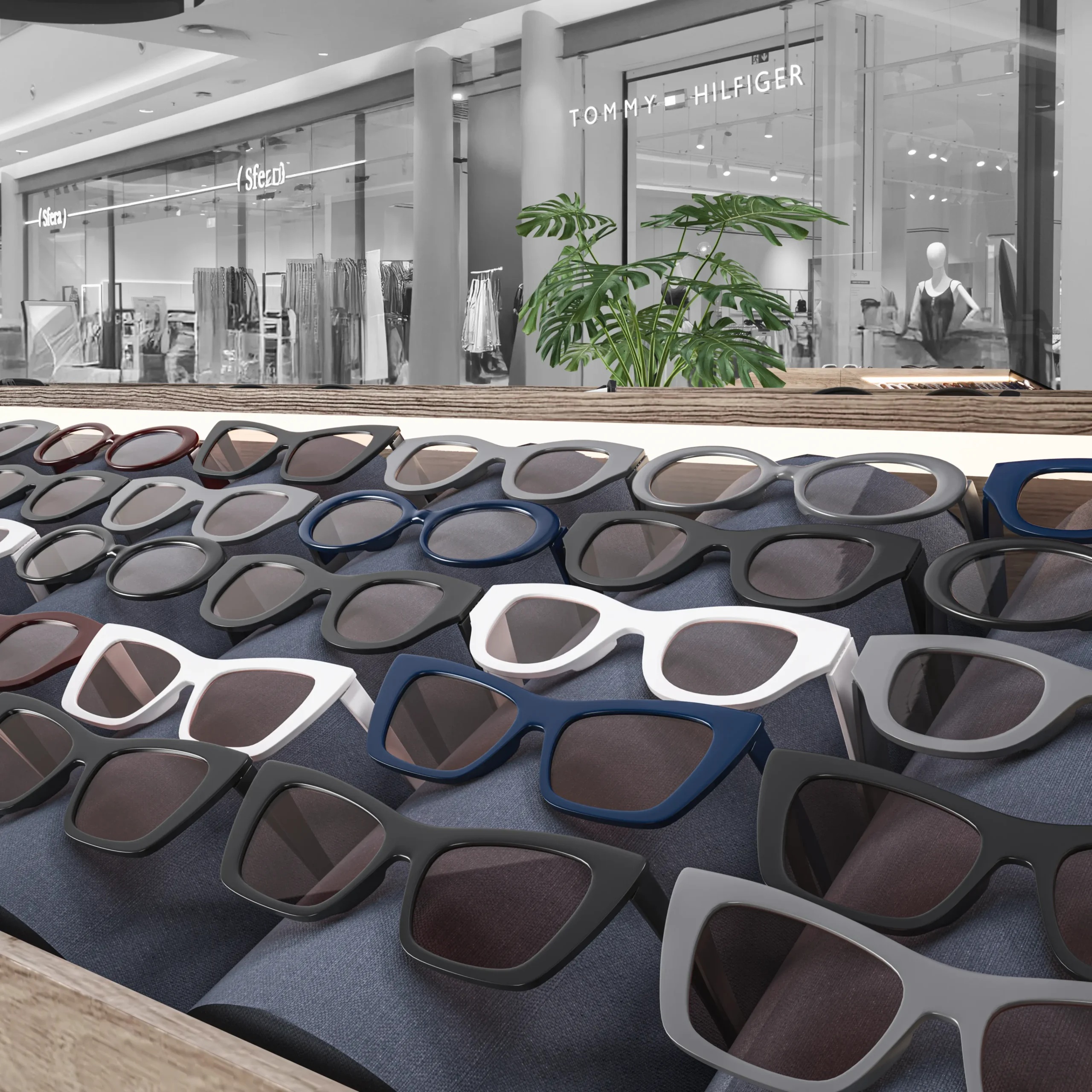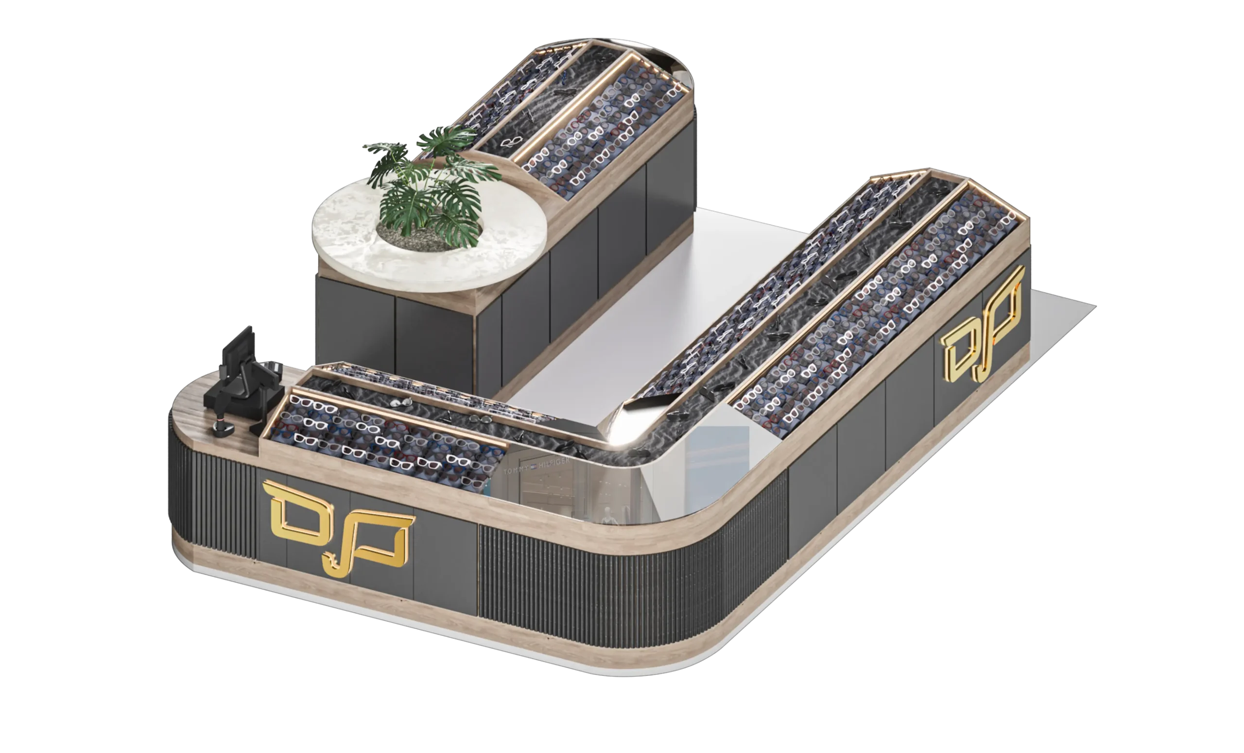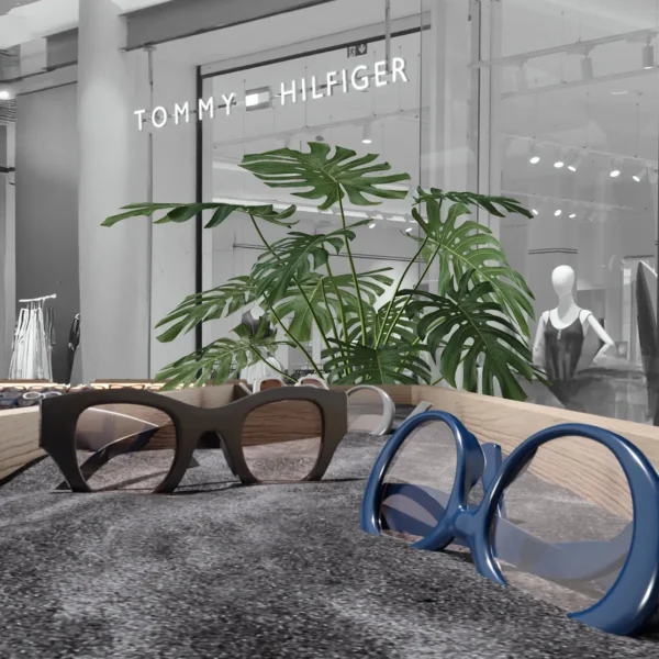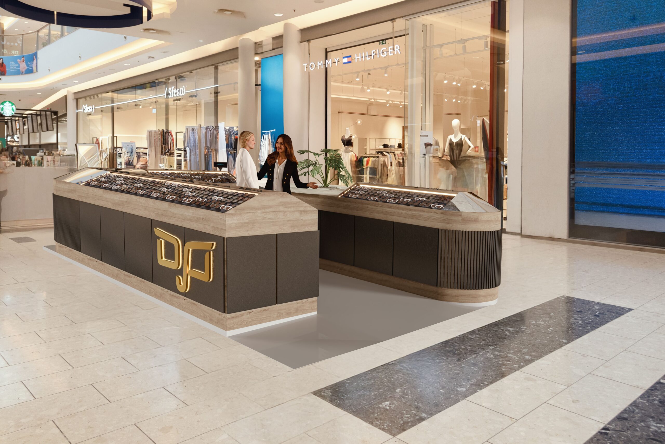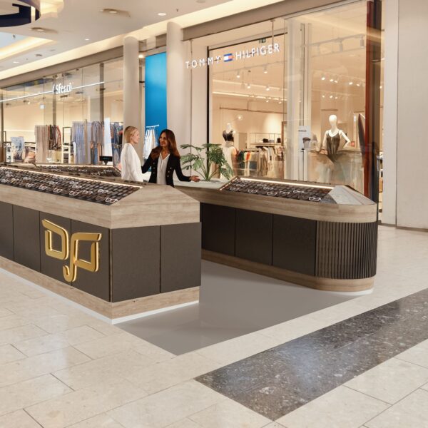 The OJO Sunglasses kiosk in Nicosia showcases a sophisticated mix of wood, marble, and mirror finishes, creating a compact yet visually striking retail presence. The design uses natural textures and clean geometric forms to highlight the eyewear collection while adding depth, elegance, and strong visual identity. This combination of materials results in a kiosk that feels modern, refined, and highly visible within the shopping environment.
