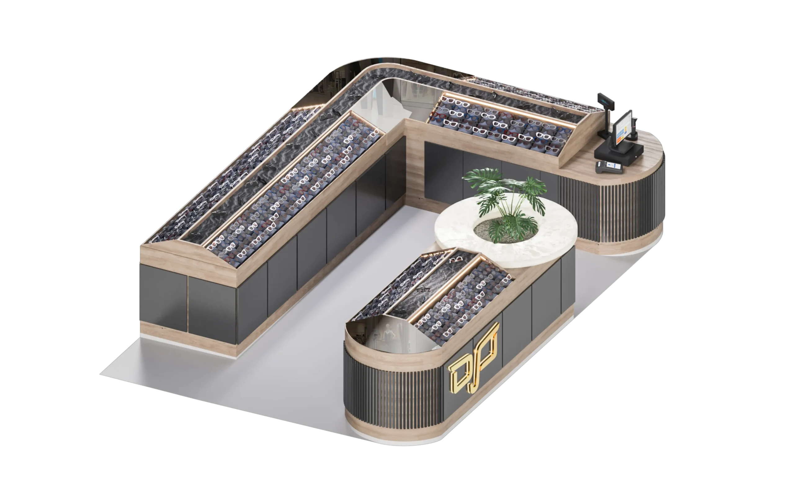 Mirrors enhance depth, making the compact kiosk appear more spacious and visually dynamic.