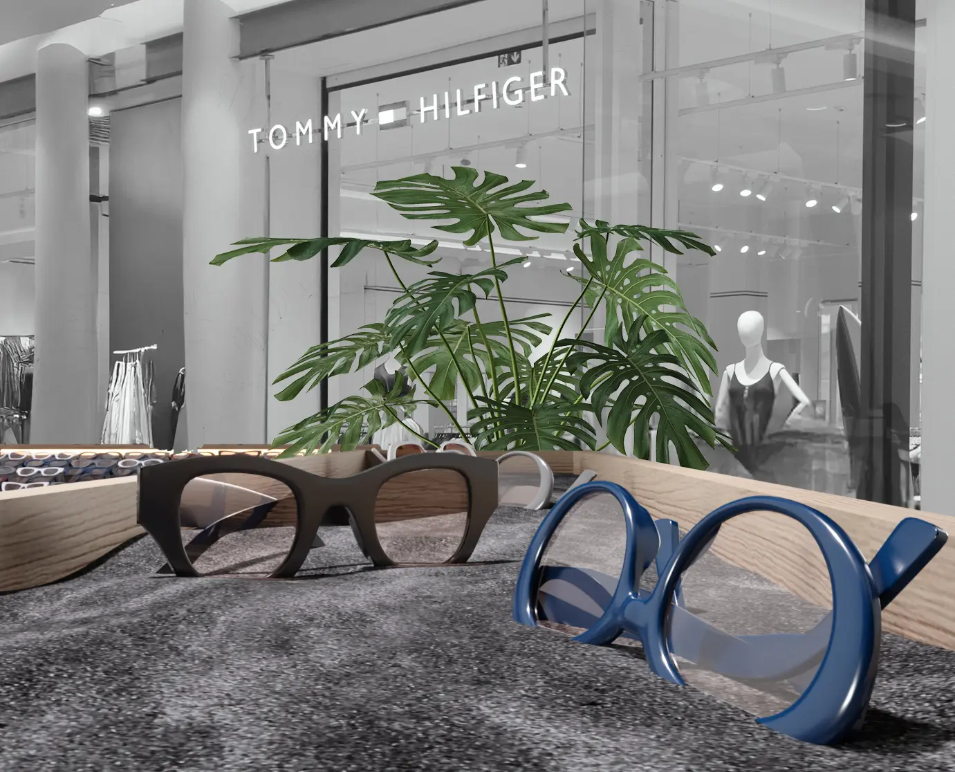 The combination of wood, marble, and mirrors creates a visually balanced retail environment.